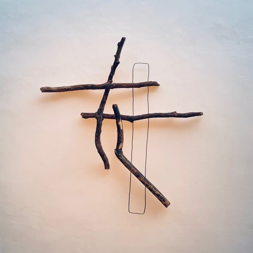 Bei diesen Arbeiten habe ich mir einen Rahmen gesetzt: Vier Schwemmholz Äste, die ich verbinde, Draht.