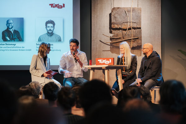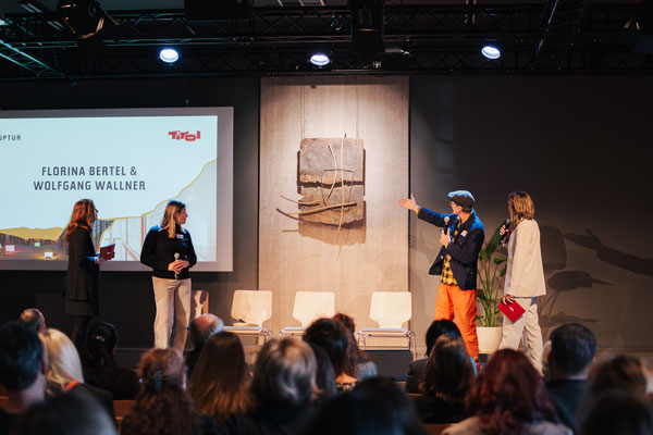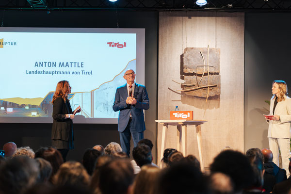 Die Präsentation der Wand-Skulptur "Der Bruch" auf dem Podium lieferte für alle Mitwirkende, darunter Landeshauptmann Anton Mattle, die Versinnbildlichung des Mottos "Ruptur". Die Skulptur entstand in einer Zeit in der unser Glaube an ewiges Wachstum und Wohlstand zu brökeln begann: 2008 war das Jahr der Lehman-Pleite und der dramatische Höhepunkte der Finanzkrise.