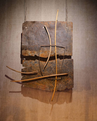 Die beiden Platten werden von einem Stahlseil miteinander verbunden, wobei sich zweimal zwei Rechtecke ergeben, die im Verhältnis zueinander stehen. Die Haselruten schweben darüber und zeichnen wie Vektoren die Kraftlinien nach. Eine der drei Ruten ist in zwei gebrochen. Auch hier gibt es wieder dieses Verhältnis von zwei und zwei.